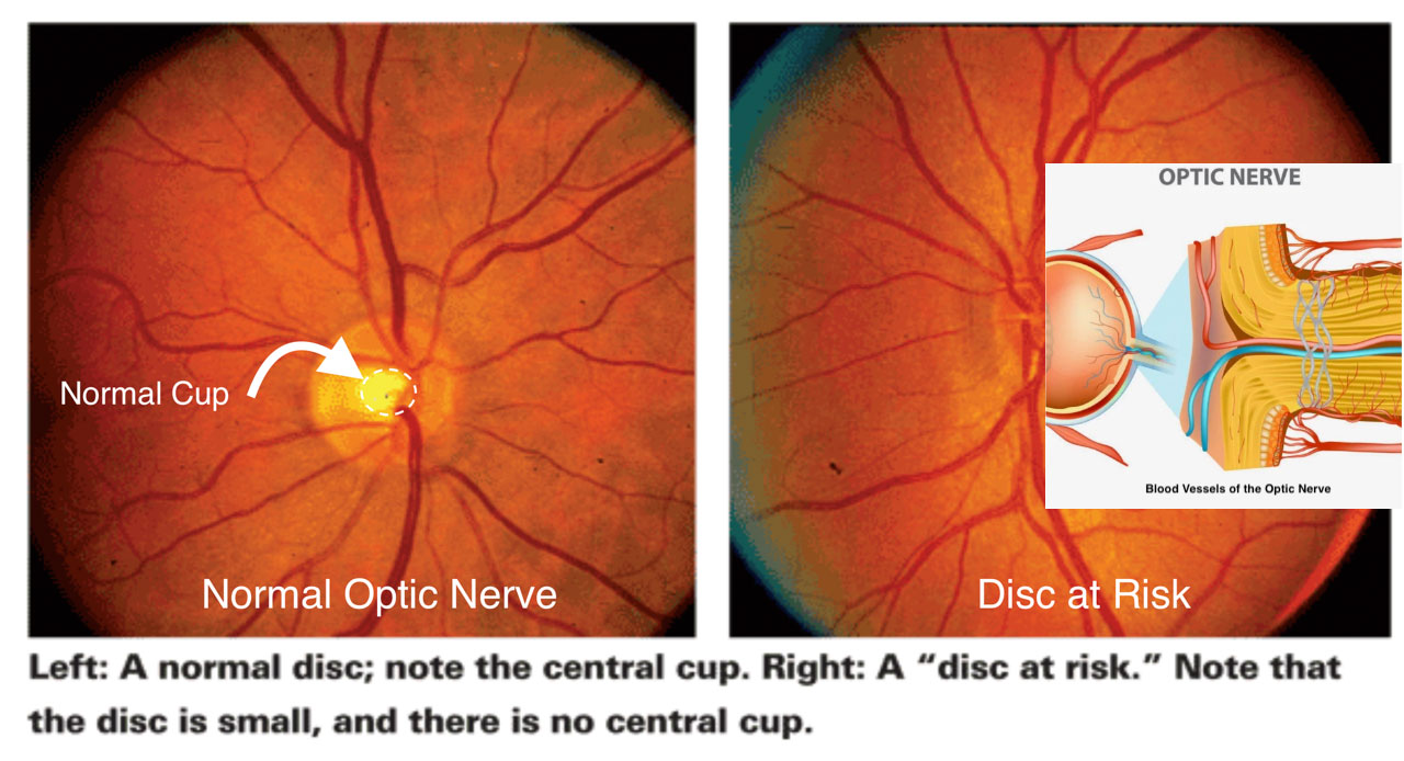 - “Disc at risk” (small, crowded optic nerve cup) is frequently present in 60–80% of cases of NAION. 3