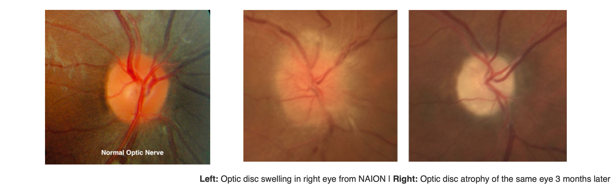NAION is essentially an “eye stroke” of the optic nerve which is the cable that carries signals from the eye to the brain. Blood flow through tiny vessels at the front of the optic nerve drops suddenly; part of the nerve doesn’t get enough blood flow and oxygen, and some nerve fibers die. People notice dim, blurry, or partially missing vision in one eye, typically without pain. NAION is more common after age 50 and in people with certain risk factors listed below. It occurs more often in eyes with a naturally crowded optic nerve called a disc at risk. 3