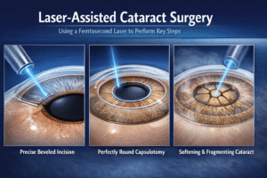 Laser-assisted cataract surgery uses a femtosecond laser to perform some of the key steps:
