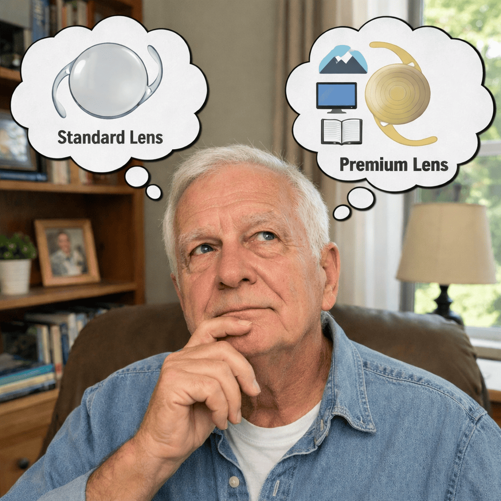 - Standard lens (insurance-covered): cataract removed, great clarity, but more glasses dependence